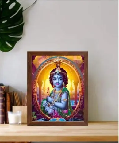 - అందమైన ఫ్రేమ్డ్ బేబీ కృష్ణ వాల్ ఆర్ట్ – వైబ్రంట్ డిజిటల్ ప్రింట్, నెమలి ఈక కిరీటం, బంగారు ఆభరణాలు మరియు పూల దండతో శ్రీకృష్ణుడిని ప్రదర్శిస్తుంది, నిర్మలమైన నది మరియు ఆలయ నేపథ్యానికి ఎదురుగా సెట్ చేయబడింది – ఇల్లు, ఆలయం లేదా కార్యాలయ అలంకరణకు సరైనది.