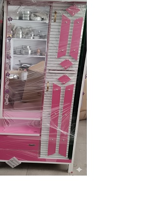 ఫీచర్ సాధారణ వివరాలుఉత్పత్తి రకం స్టీల్ అల్మిరా (వార్డ్రోబ్/కప్బోర్డ్) డ్రెస్సింగ్ మిర్రర్తోమెటీరియల్ హై-క్వాలిటీ మైల్డ్ స్టీల్ (MS) లేదా స్టెయిన్లెస్ స్టీల్ షీట్లు మరియు పైపులు.రంగు/ముగింపు పింక్ మరియు తెలుపు/లేత బూడిద రంగు (చిత్రంలో చూసినట్లు). ముగింపు సాధారణంగా మృదువైన, మన్నికైన మరియు తుప్పు-నిరోధక ఉపరితలం కోసం పౌడర్ కోటింగ్.2-డోర్లు లేదా 3-డోర్ల హింగ్డ్ కప్బోర్డ్ను డిజైన్ చేయండి. ఇది తలుపుపై అలంకార పింక్ మెటల్ ప్యానెల్లను (డైమండ్/దీర్ఘచతురస్రాకార ఆకారాలు) కలిగి ఉంటుంది.ఒక తలుపుపై మిర్రర్ ఫుల్-సైజు డ్రెస్సింగ్ మిర్రర్.కొలతలు (సుమారుగా) ఎత్తు: 6.5 నుండి 7 అడుగులు (సుమారుగా 78-84 అంగుళాలు)వెడల్పు: 3 నుండి 4 అడుగులు (సుమారుగా 36-48 అంగుళాలు)లోతు: 1.5 నుండి 1.8 అడుగులు (సుమారుగా 18-22 అంగుళాలు)స్టోరేజ్ ఫీచర్లు అంతర్గత నిల్వ: బట్టలు మరియు వస్తువుల కోసం బహుళ అల్మారాలు.హ్యాంగింగ్ రాడ్: బట్టలు వేలాడదీయడానికి ఉపయోగించే రాడ్ (షర్టులు, సూట్లు మొదలైనవి).లాకర్లు: సాధారణంగా విలువైన వస్తువుల కోసం 1-2 చిన్న, సురక్షితమైన లాకర్ కంపార్ట్మెంట్లు (అల్ట్రాకీ సిస్టమ్తో) ఉంటాయి.దిగువ నిల్వ: తరచుగా దిగువన పెద్ద సూట్కేస్ లాకర్/డ్రాయర్ ఉంటుంది.భద్రత అధిక-నాణ్యత యూరోపియన్ స్టాండర్డ్ లాక్లు లేదా ఇలాంటి లాకింగ్ మెకానిజమ్లు.