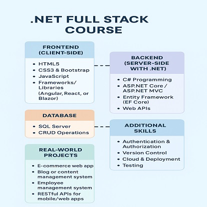 .NET ఫుల్ స్టాక్ కోర్సు అనేది మైక్రోసాఫ్ట్ యొక్క .NET ఫ్రేమ్వర్క్ మరియు సంబంధిత సాంకేతికతలను ఉపయోగించి పూర్తి వెబ్ అప్లికేషన్లను ఎలా నిర్మించాలో నేర్పించే శిక్షణా కార్యక్రమం. “ఫుల్ స్టాక్” అంటే మీరు డేటాబేస్లు మరియు డిప్లాయ్మెంట్ నైపుణ్యాలతో పాటు ఫ్రంటెండ్ (క్లయింట్-సైడ్) మరియు బ్యాకెండ్ (సర్వర్-సైడ్) అభివృద్ధి రెండింటినీ నేర్చుకుంటారు.