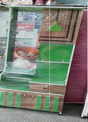 - మధ్య విభాగం: ప్రకాశవంతమైన ఆకుపచ్చ వెనుక ప్యానెల్‌తో ఓపెన్ షెల్వింగ్. వస్తువులు ప్రస్తుతం ఇక్కడ నిల్వ చేయబడ్డాయి (గిన్నెలు, వస్త్రం).