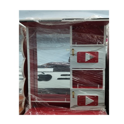 2 అడుగుల ఆధునిక డ్రెస్సింగ్ టేబుల్, దీనికి ఎరుపు మరియు తెలుపు రంగుల కలయిక, పూర్తి పొడవు అద్దం మరియు ఒక ప్రత్యేకమైన జ్యామితీయ డిజైన్‌తో కూడిన ఓపెన్ షెల్ఫ్‌లు ఉన్నాయి.